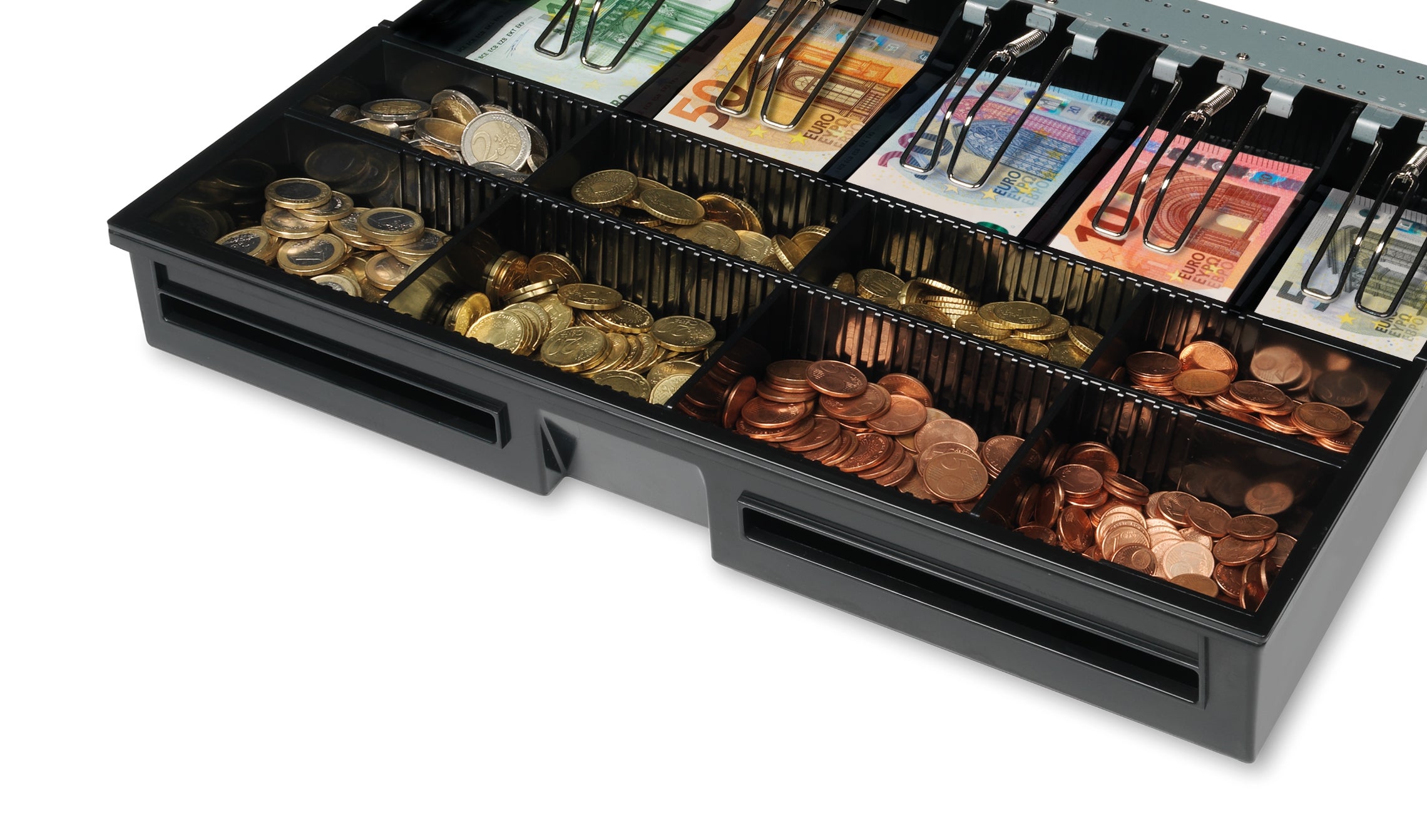 Przegrody na banknoty we wkładzie 4646T można wyregulować dokładnie według swoich potrzeb, a 8 regulowanej wielkości pojemników na monety pozwala uporządkować drobne czy żetony w jednym miejscu. W szufladzie są też dwa oddzielne miejsca do przechowywania kuponów, potwierdzeń płatności kartą kredytową czy innych przedmiotów niegotówkowych.
